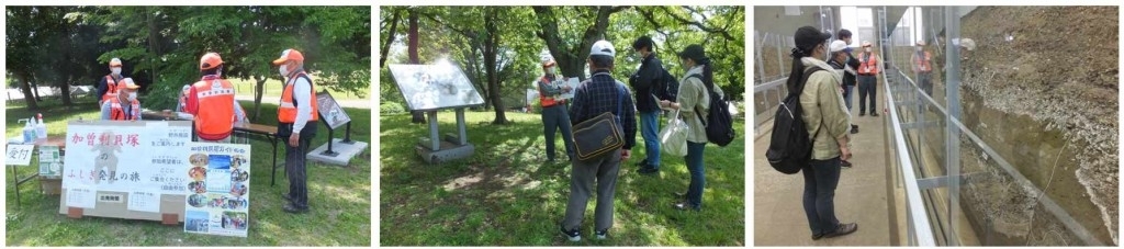 図9(左):「縄文不思議発見の旅」の受付での打ち合わせ風景。図10(中央):加曾利E式土器発掘場所での説明風景。図11(右):北貝塚貝層断面の説明風景。